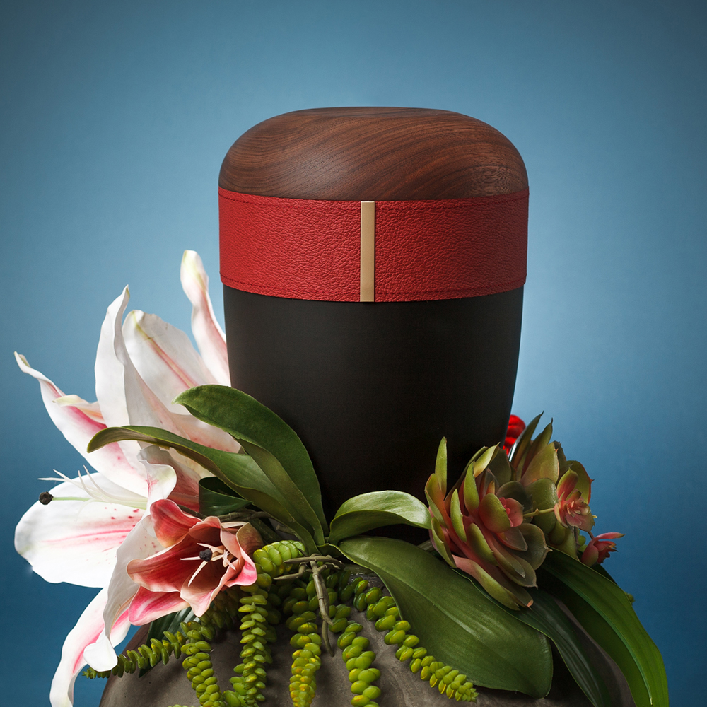 - 🪵 Dřevo a kůže (víko urny) – ořechové dřevo a kůže z evropské produkce