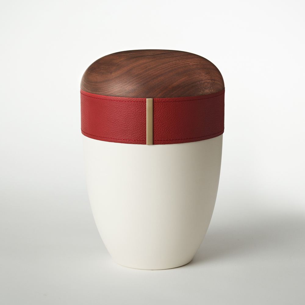 Urna Bordeaux od společnosti SAMOSA je kombinací moderních přírodních materiálů s klasickými materiály, jako je kůže a dřevo.