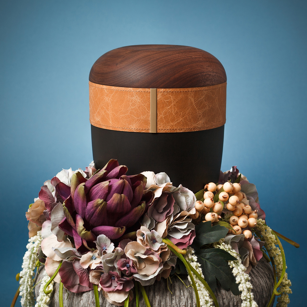 - 🪵 Dřevo a kůže (víko urny) – ořechové dřevo a kůže z evropské produkce