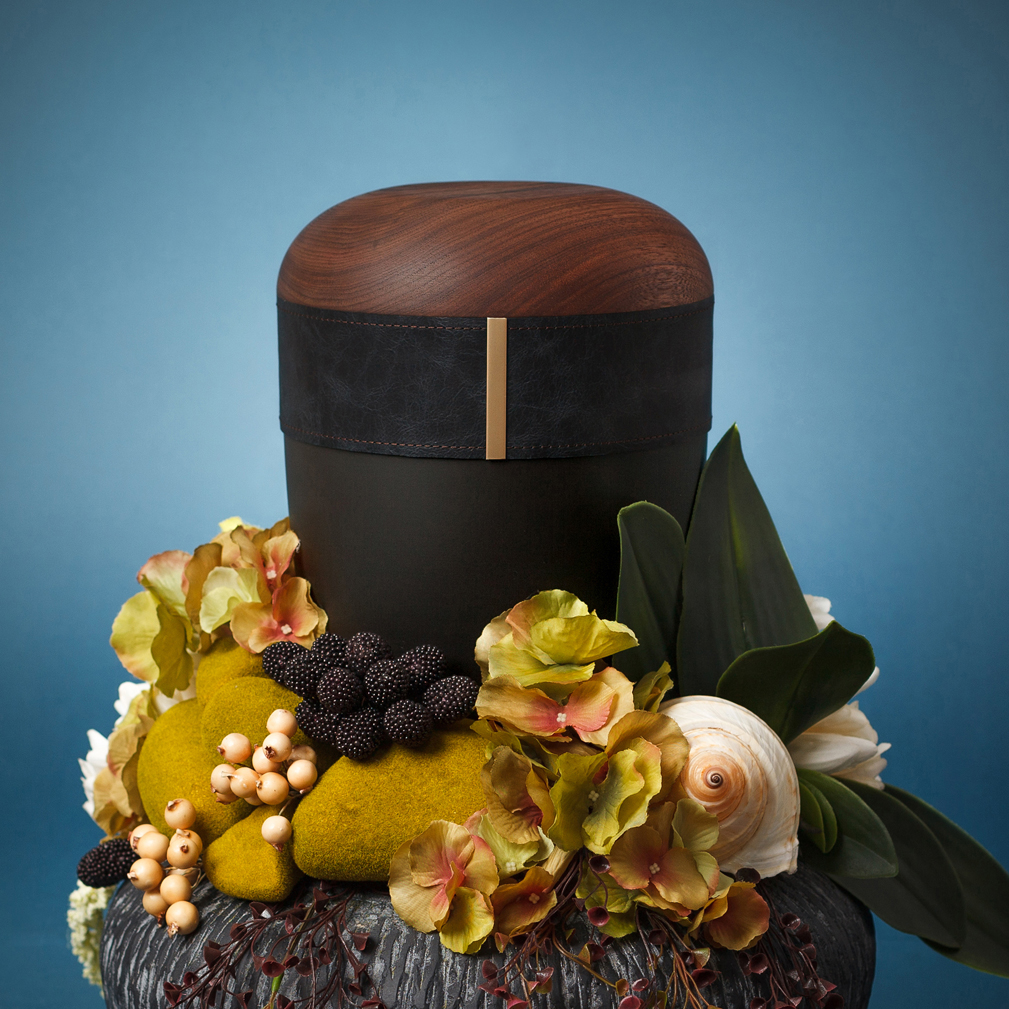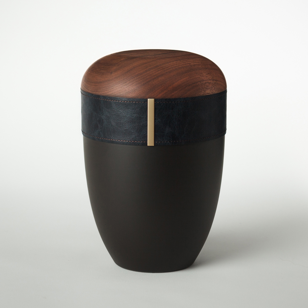 - Design urny v grafitové barvě kůže společně s ořechovým dřevem působí moderně a decentně. Tmavý odstín kůže symbolizuje sílu, důstojnost a eleganci.
