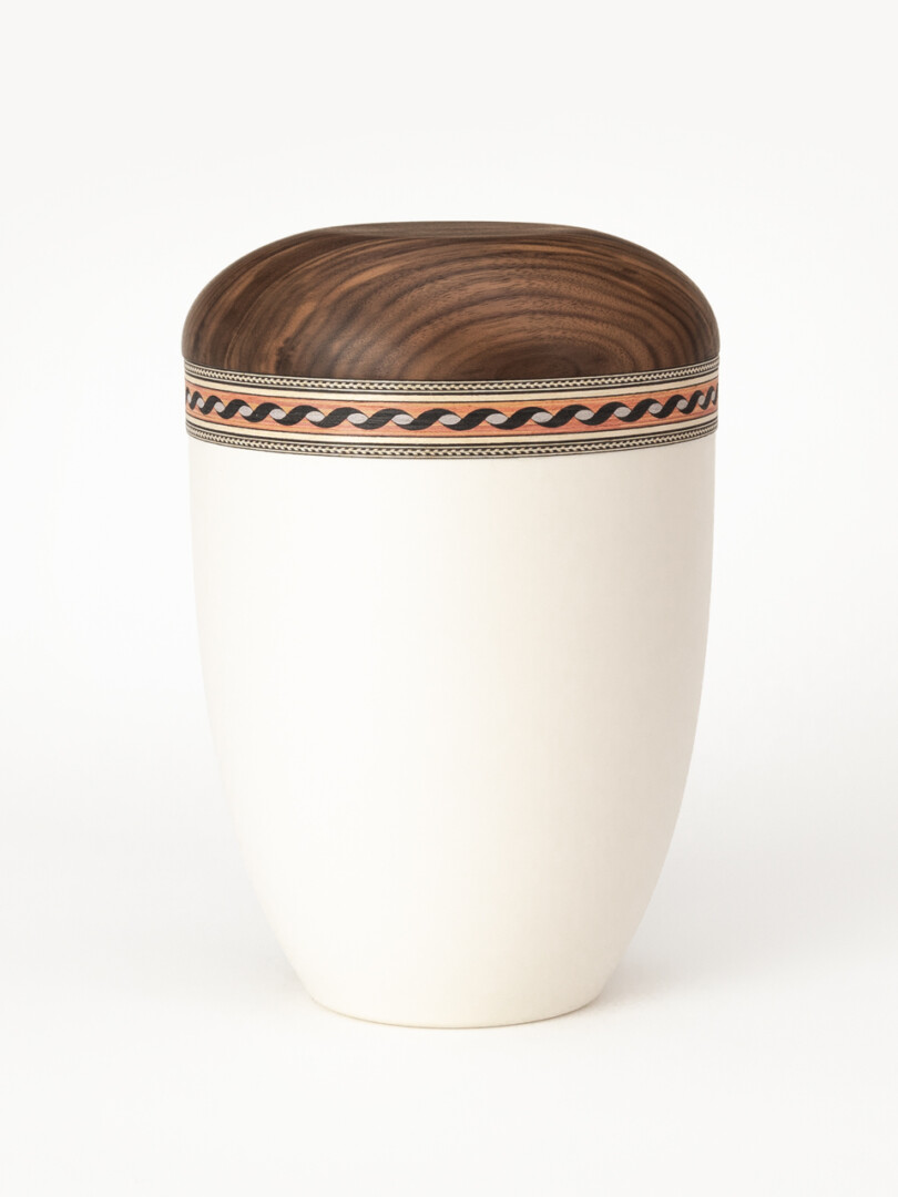 - 🪵 Dřevo (víko urny) – ořechové dřevo a intarzovaný pásek