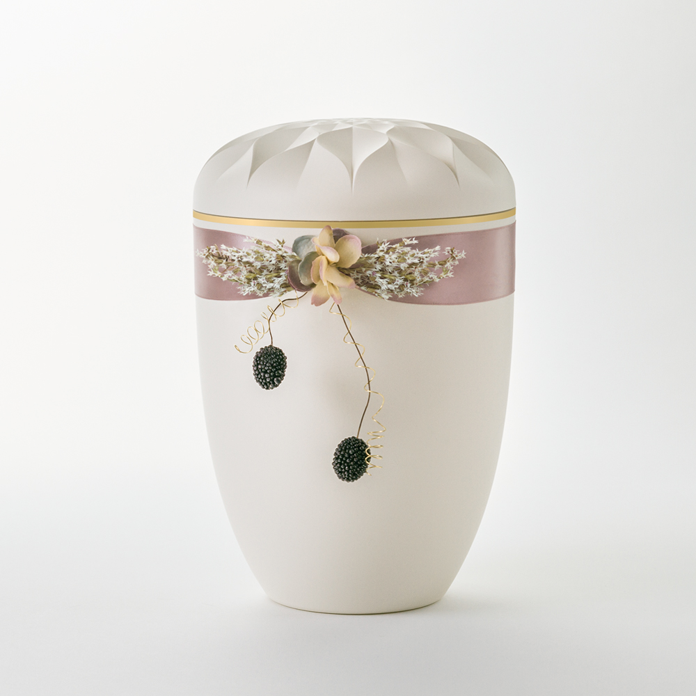 - Saténová stuha v barvě růžového dřeva krásně zdobí světlou urnu. Hedvábné květiny a dvě dekorativní ostružiny zdůrazňují výzdobu urny a dodávají jí ušlechtilý vzhled.