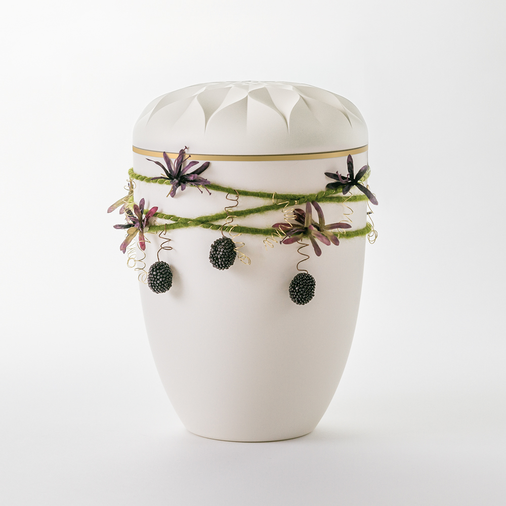 - Jemná ozdoba z plstěné šňůry po obvodu je zdobena jemnými hedvábnými květy a zlatým drátem. Ostružiny dodávají výzdobě urny přírodní nádech.