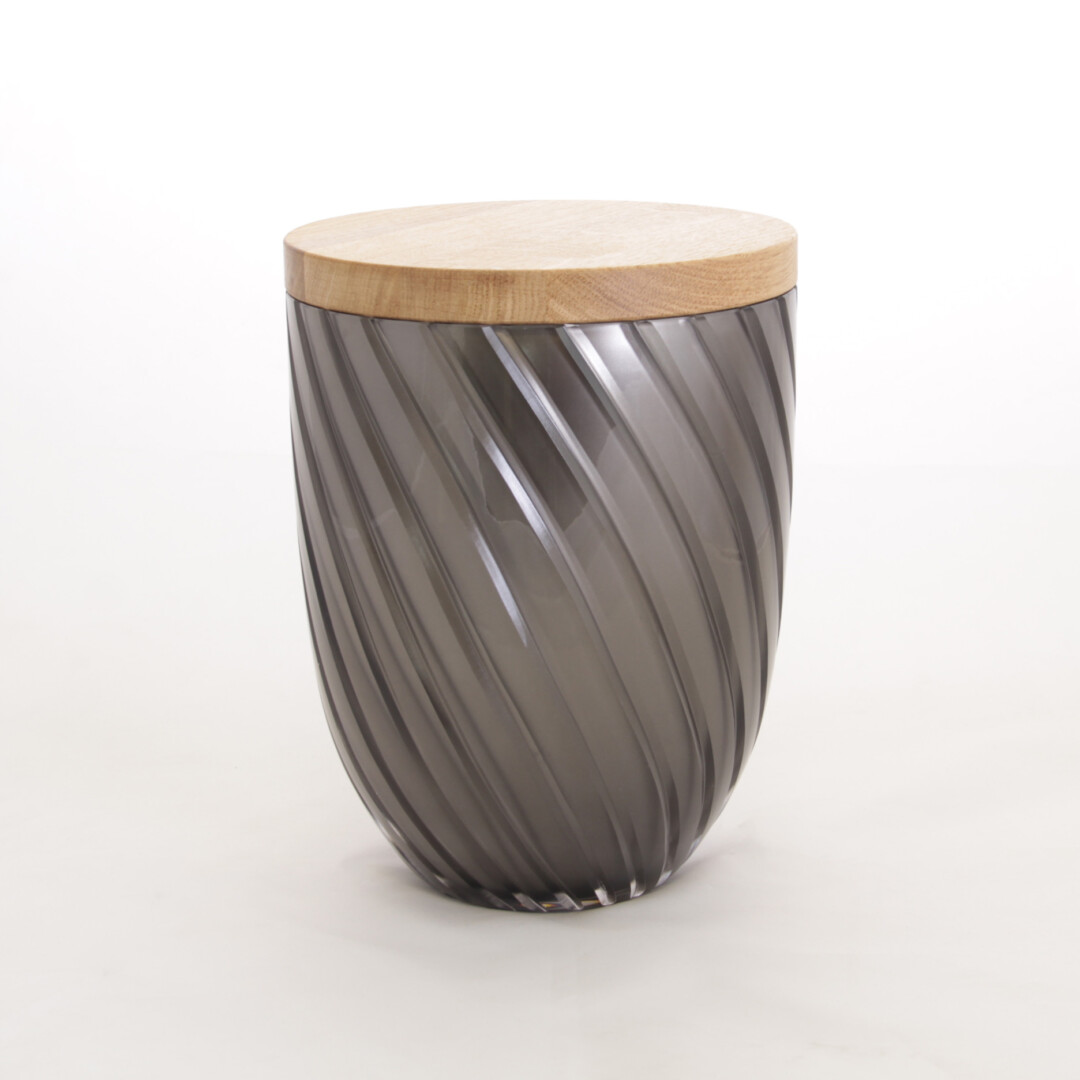 Ručně foukaná urna z kvalitního křišťálu. Moderní design jednoduchého tvaru v kombinaci s vnitřním nástřikem urny v metalické barvě vytváří velmi luxusní vzhled. Povrch zdobí pravidelně broušené diagonální linie, které se spirálovitě stáčejí kolem těla urny a vytvářejí výrazný plastický efekt. Broušení dodává sklu hloubku, jemnou hru světla a elegantní charakter. Víko z dubového masivu přináší do designu teplo přírodního materiálu a citlivě doplňuje jemnost křišťálu.