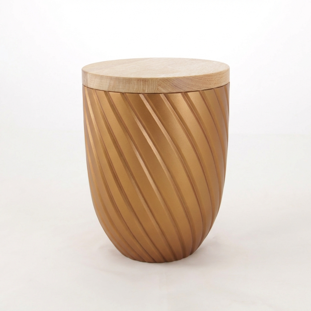 Ručně foukaná urna z kvalitního křišťálu. Moderní design jednoduchého tvaru v kombinaci s vnitřním nástřikem urny v metalické barvě vytváří velmi luxusní vzhled. Povrch zdobí pravidelně broušené diagonální linie, které se spirálovitě stáčejí kolem těla urny a vytvářejí výrazný plastický efekt. Broušení dodává sklu hloubku, jemnou hru světla a elegantní charakter. Víko z dubového masivu přináší do designu teplo přírodního materiálu a citlivě doplňuje jemnost křišťálu.